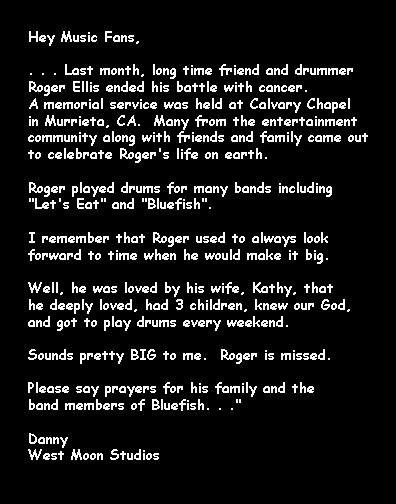 "To all our dear friends and fans- We regret to inform you that our beloved drummer and friend Roger Ellis passed away and moved to a better place this past May. We wish him well on this new journey and thank him for a lifetime of laughter, great music and wonderful times. Rock on Roger.